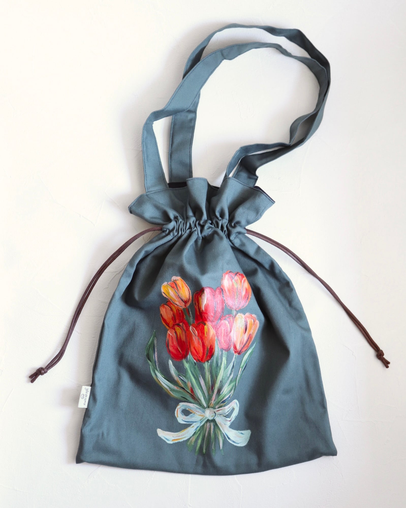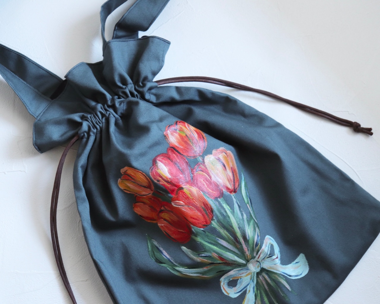 手描きのチューリップブーケが描かれた巾着トートバッグ