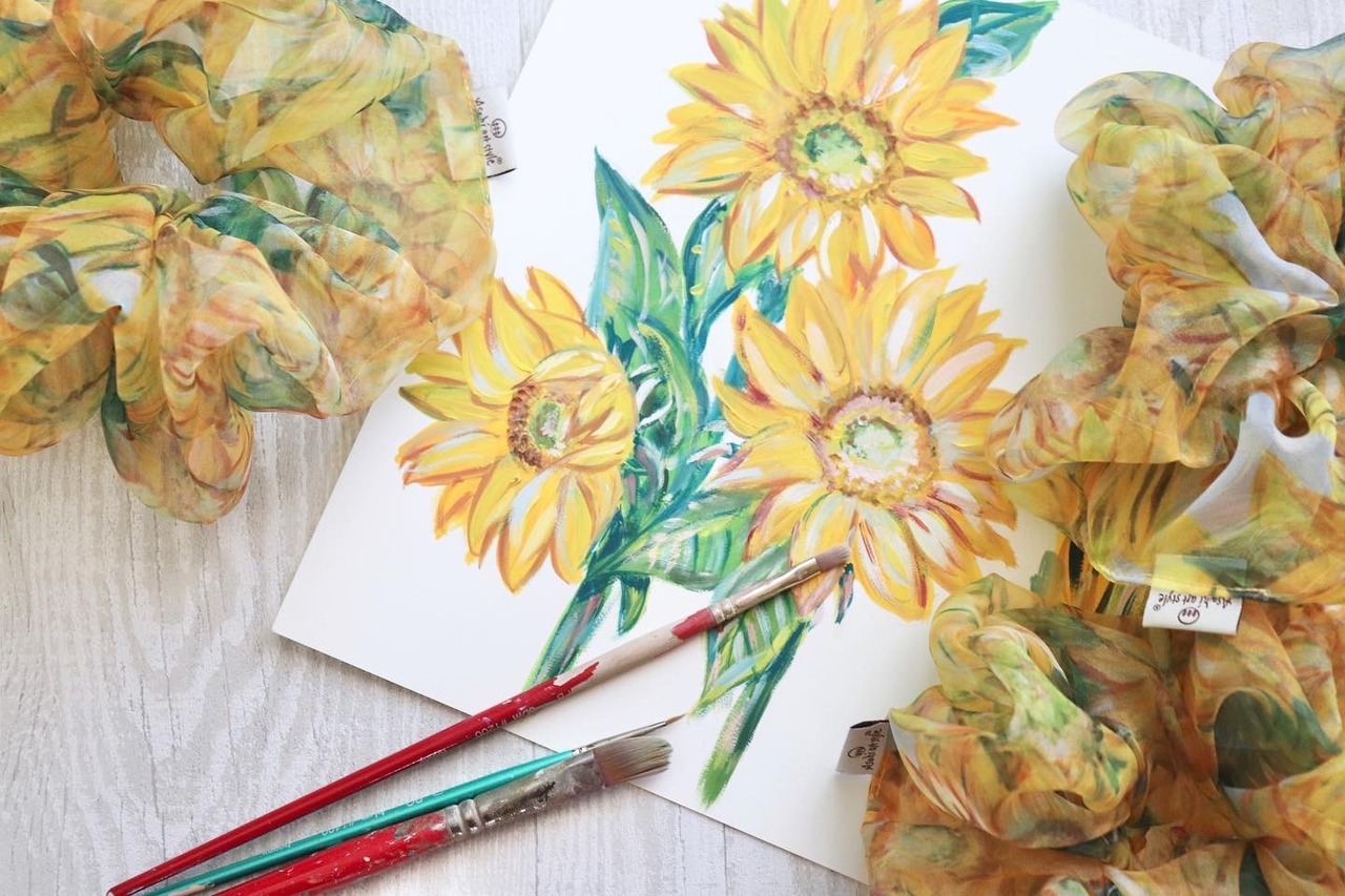 ひまわりのアートシュシュ <Asahi art styleオリジナルテキスタイル> お花柄のビッグシュシュ