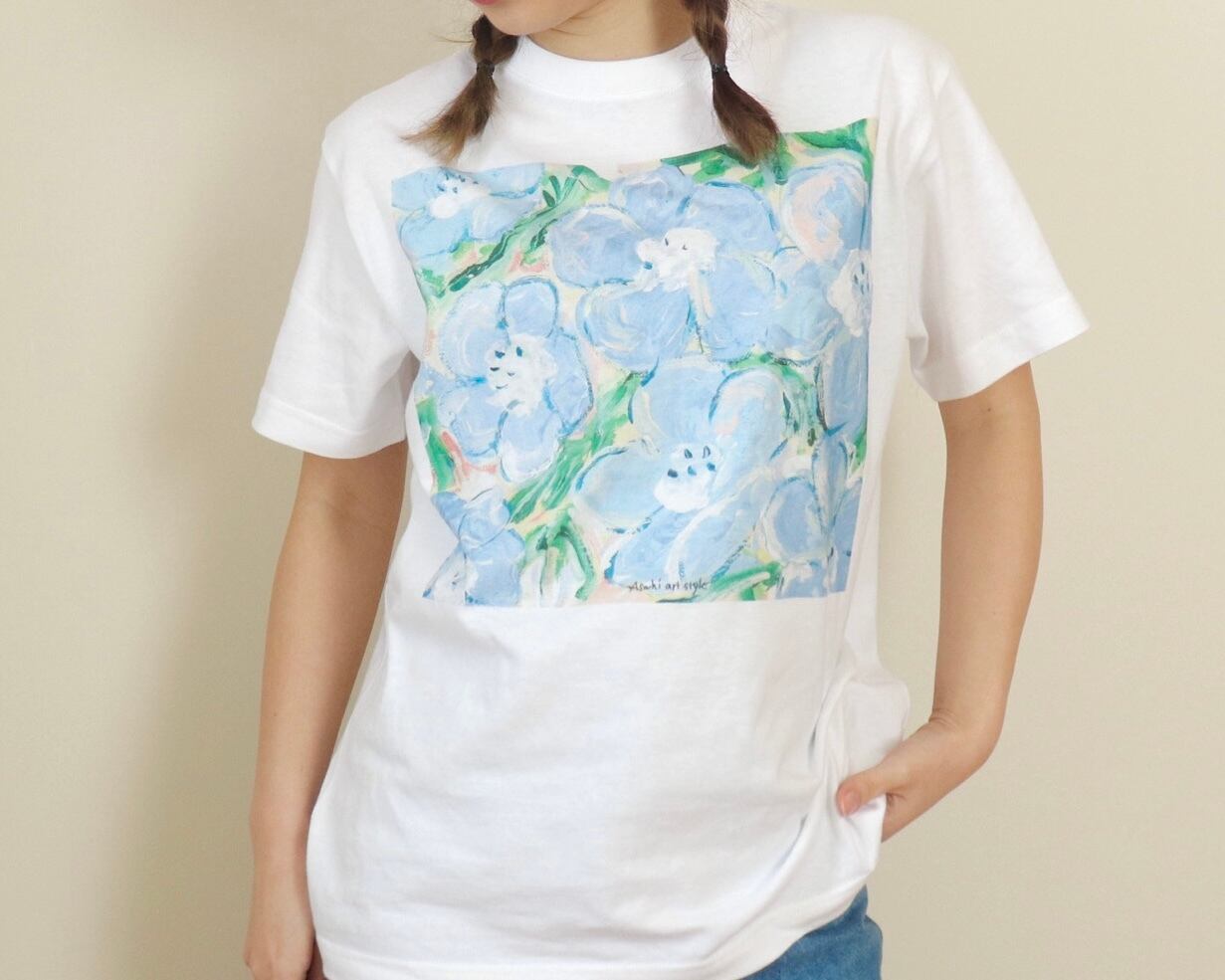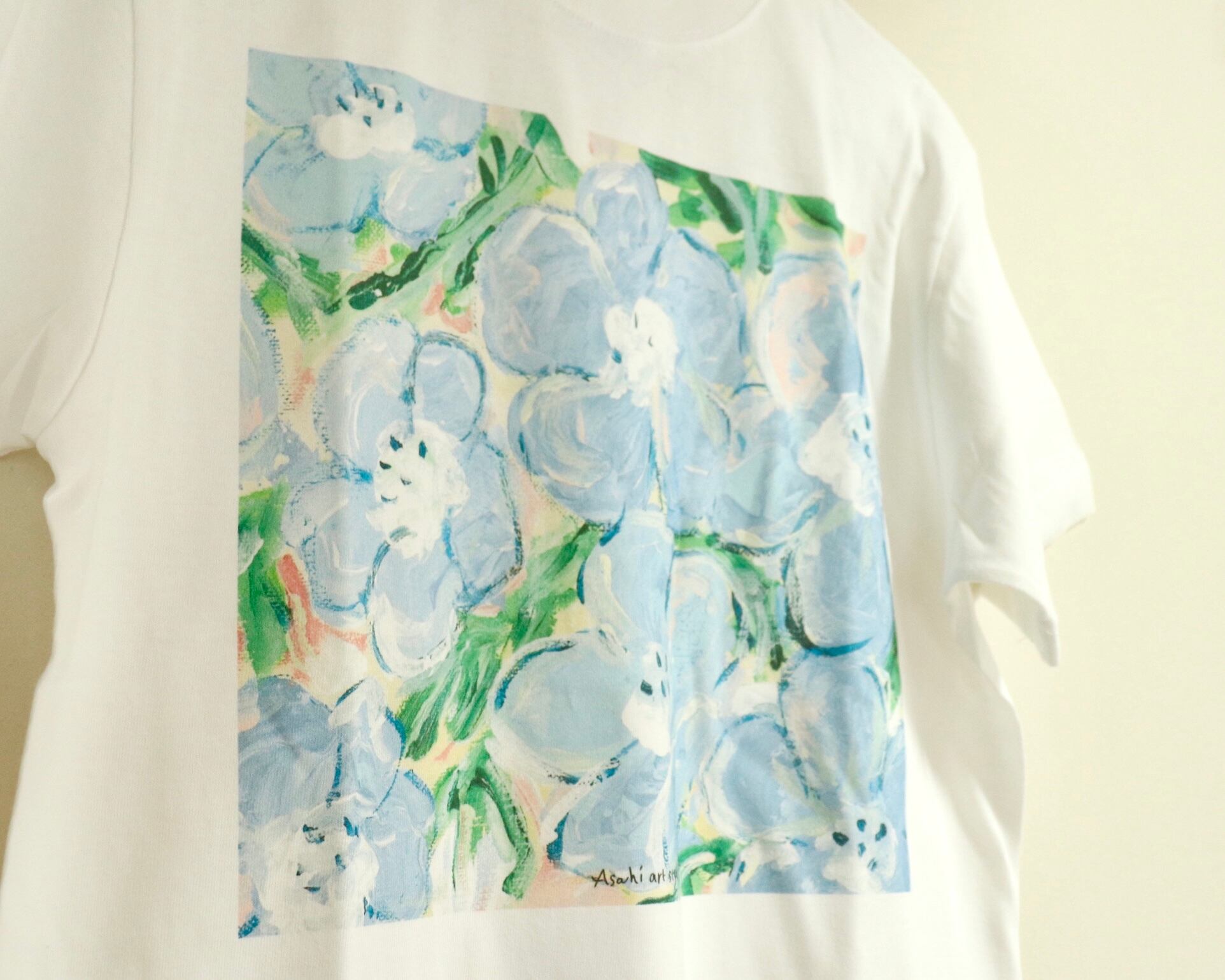 ネモフィラの花が咲く春から夏にかけて、そんな季節にぴったりの、大胆なアートが印象的なTシャツです。