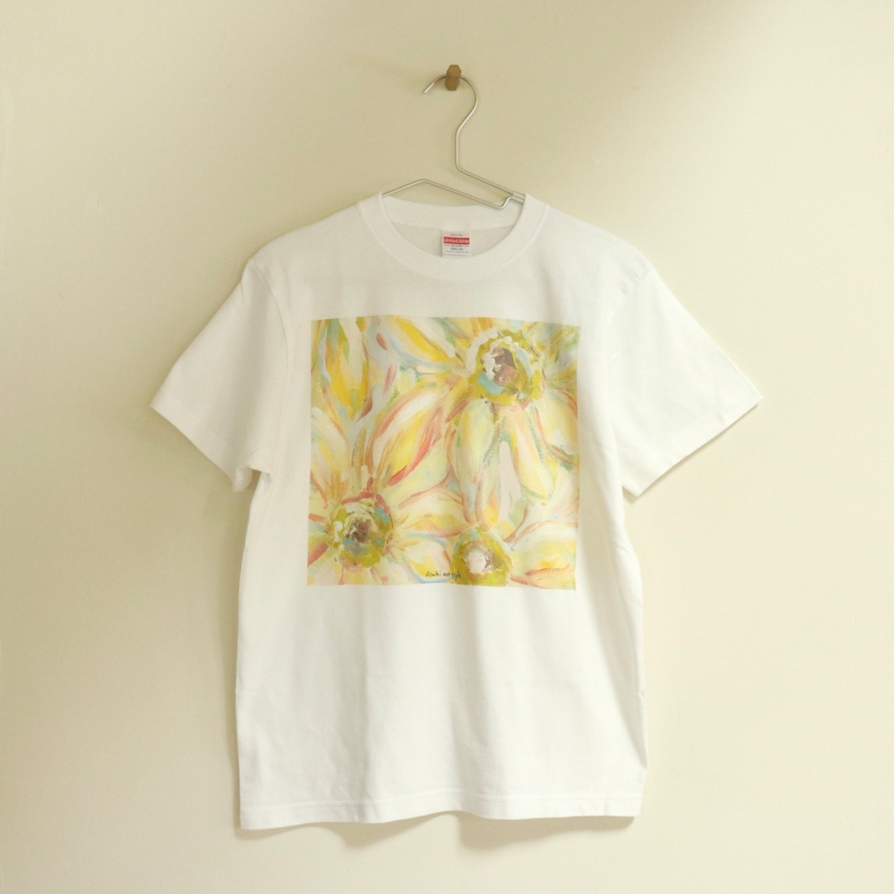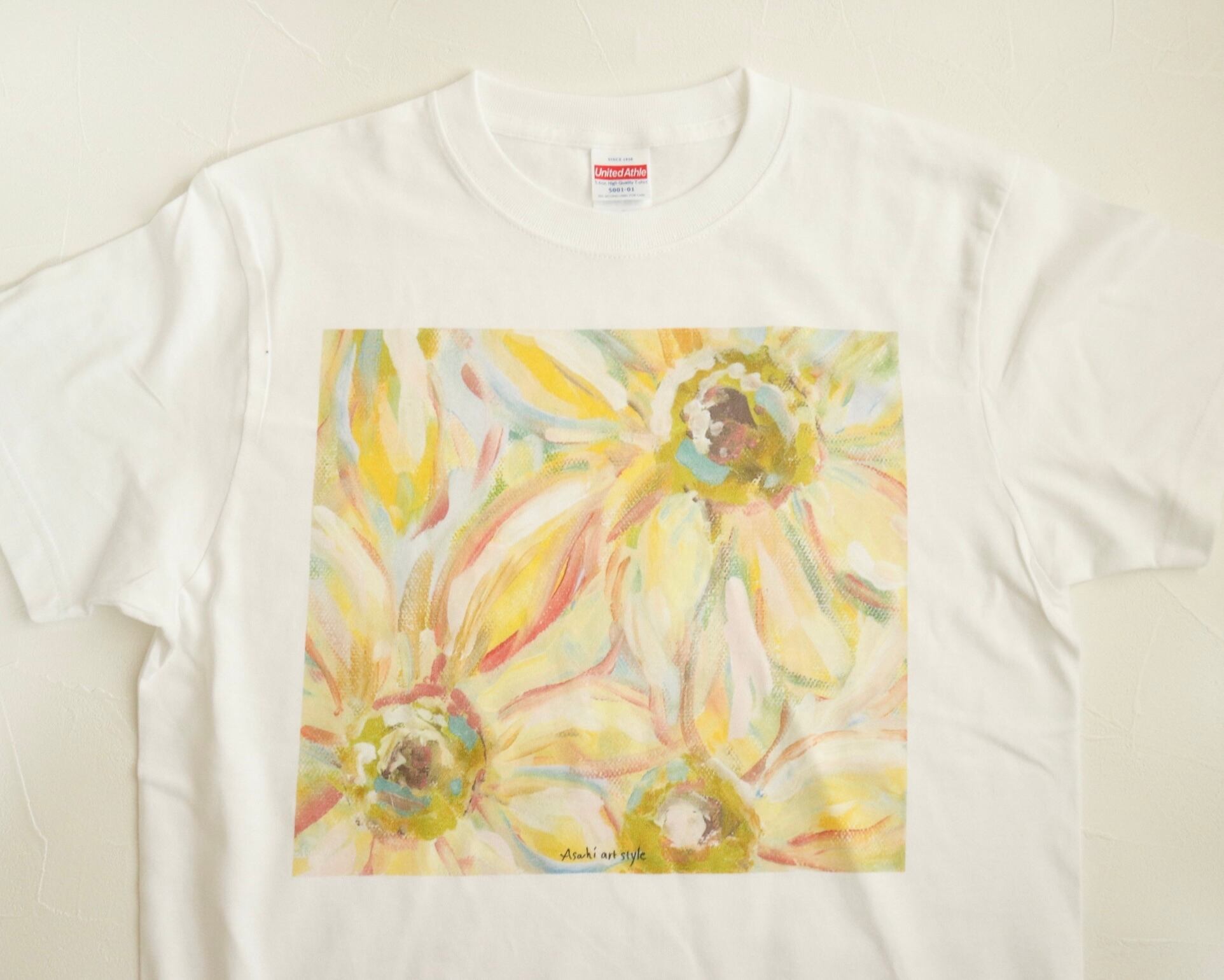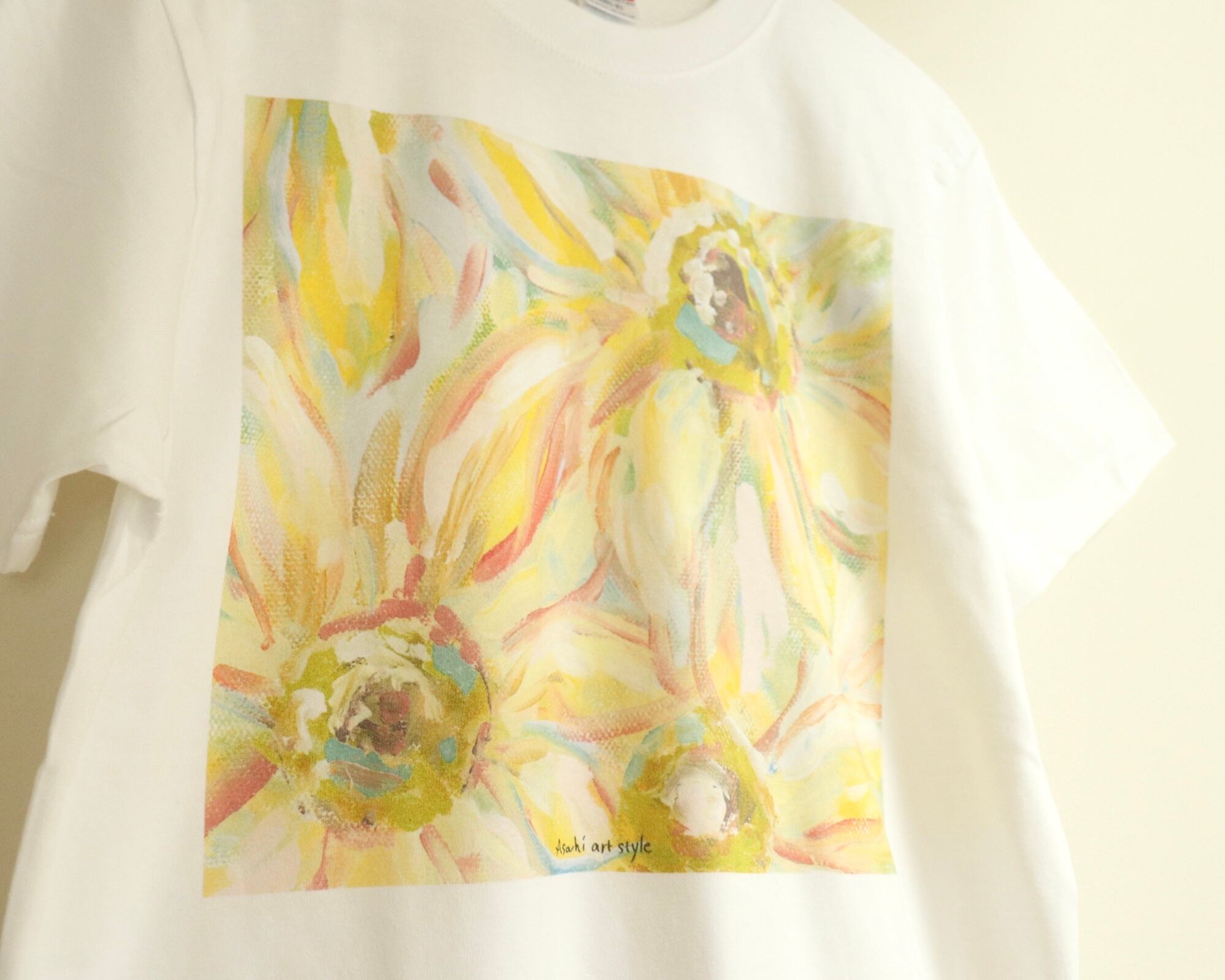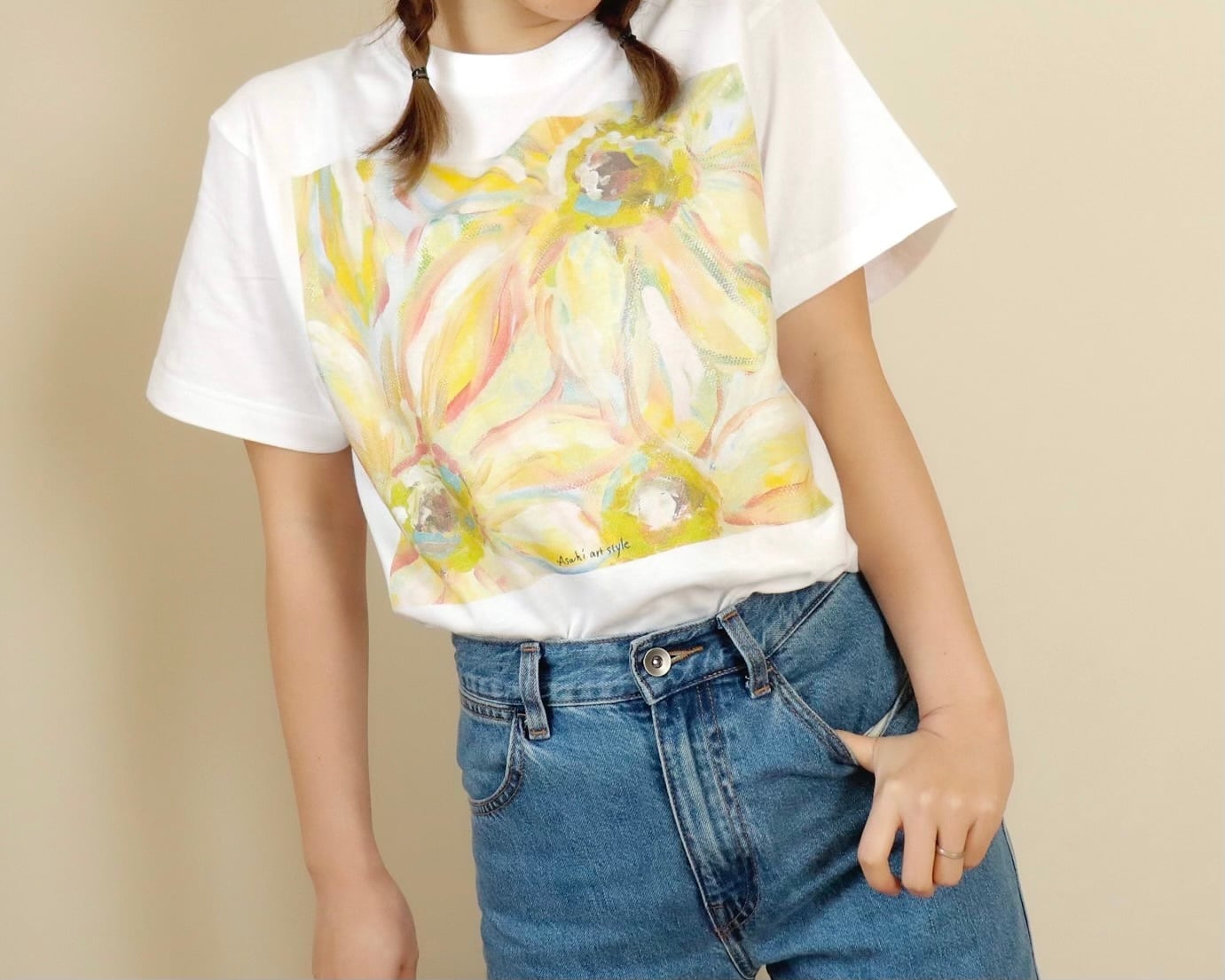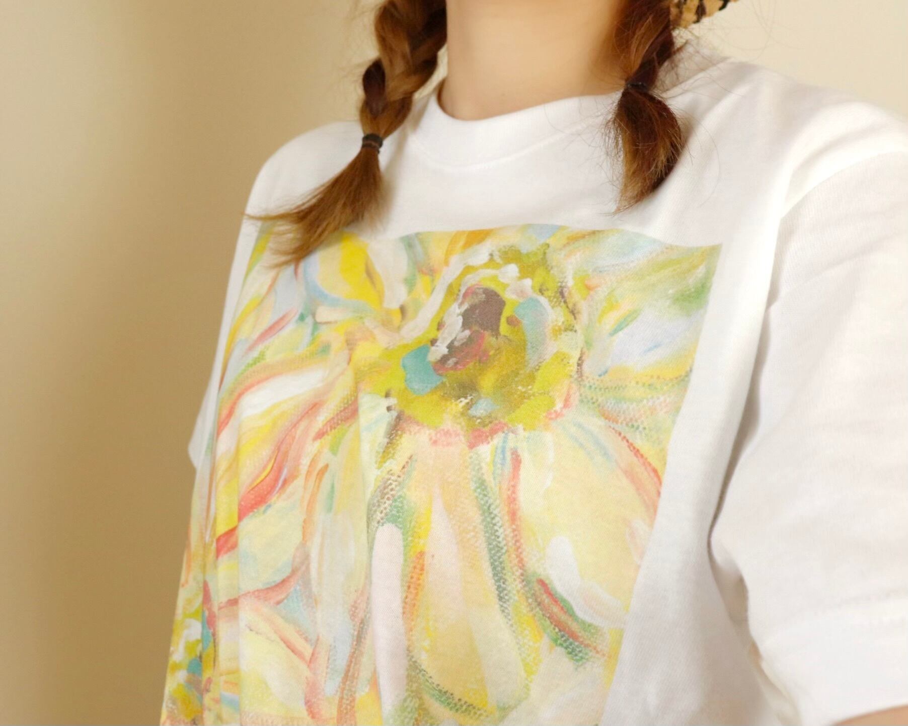 ひまわりの花が咲く、そんな季節にぴったりの、大胆なアートが印象的なTシャツです。