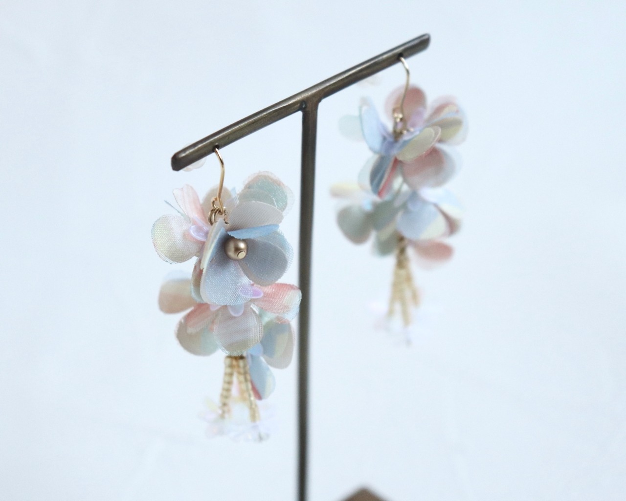 オリジナルのテキスタイルの柔らかなオーガンジー生地を片18枚を使ってボリューム感が楽しく、華やかな耳飾り