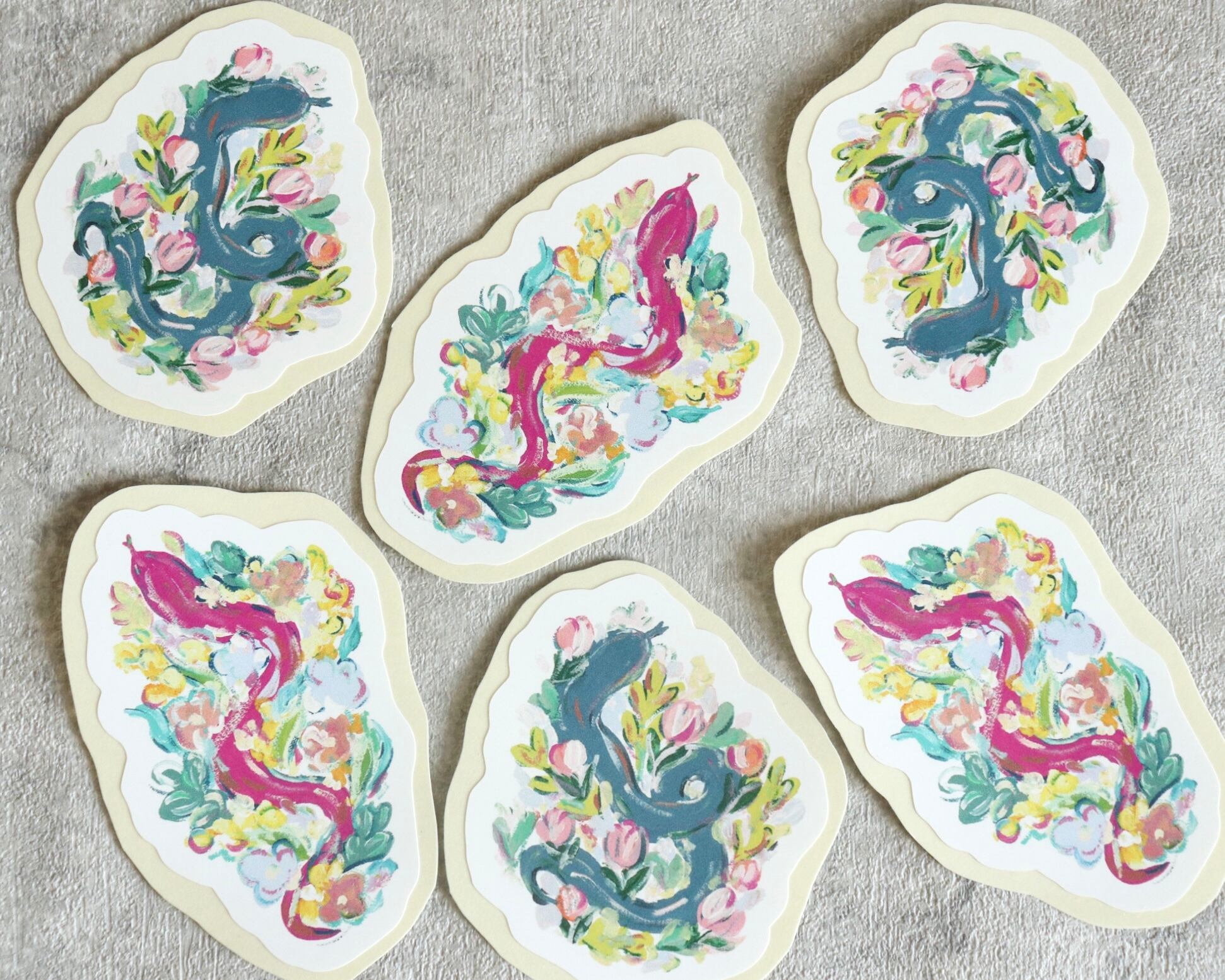 ステッカー 「花に囲まれた ヘビ 」青ピンクの2枚セット