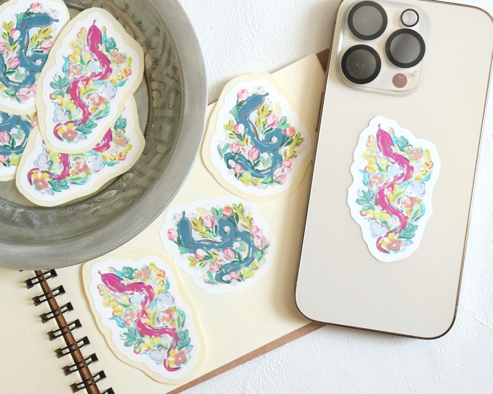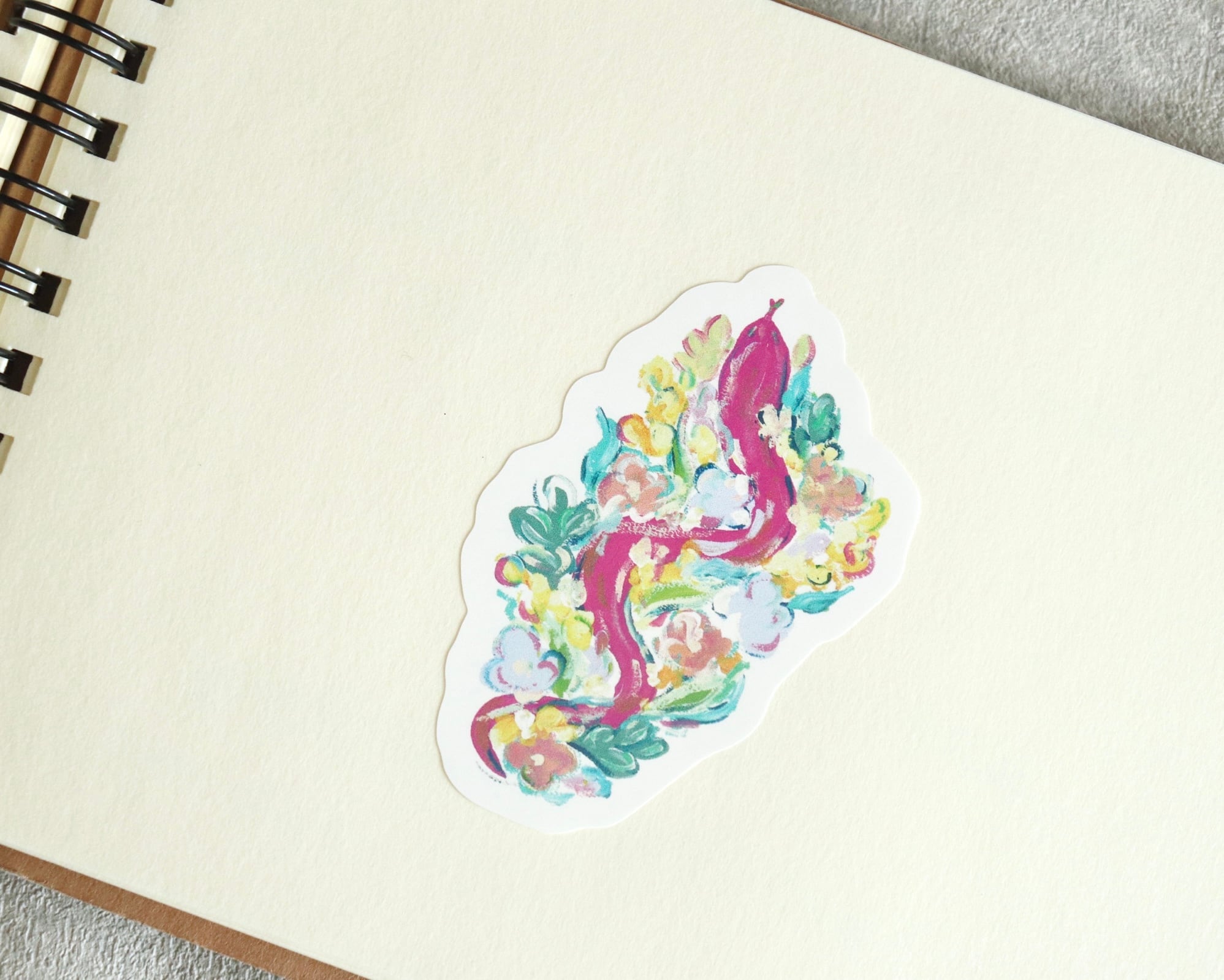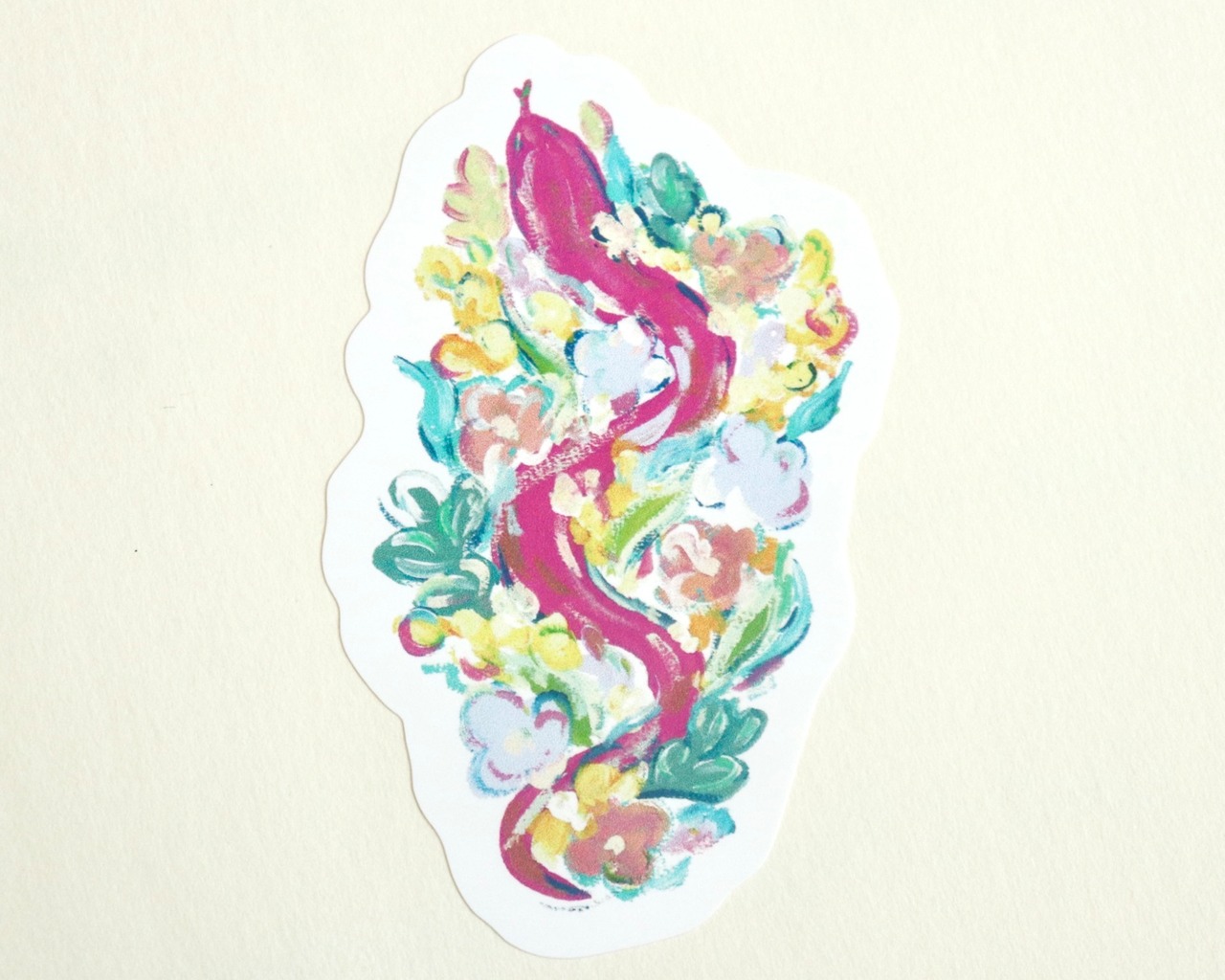 神秘的な蛇と可愛らしい花柄の組み合わせが魅力のステッカーです