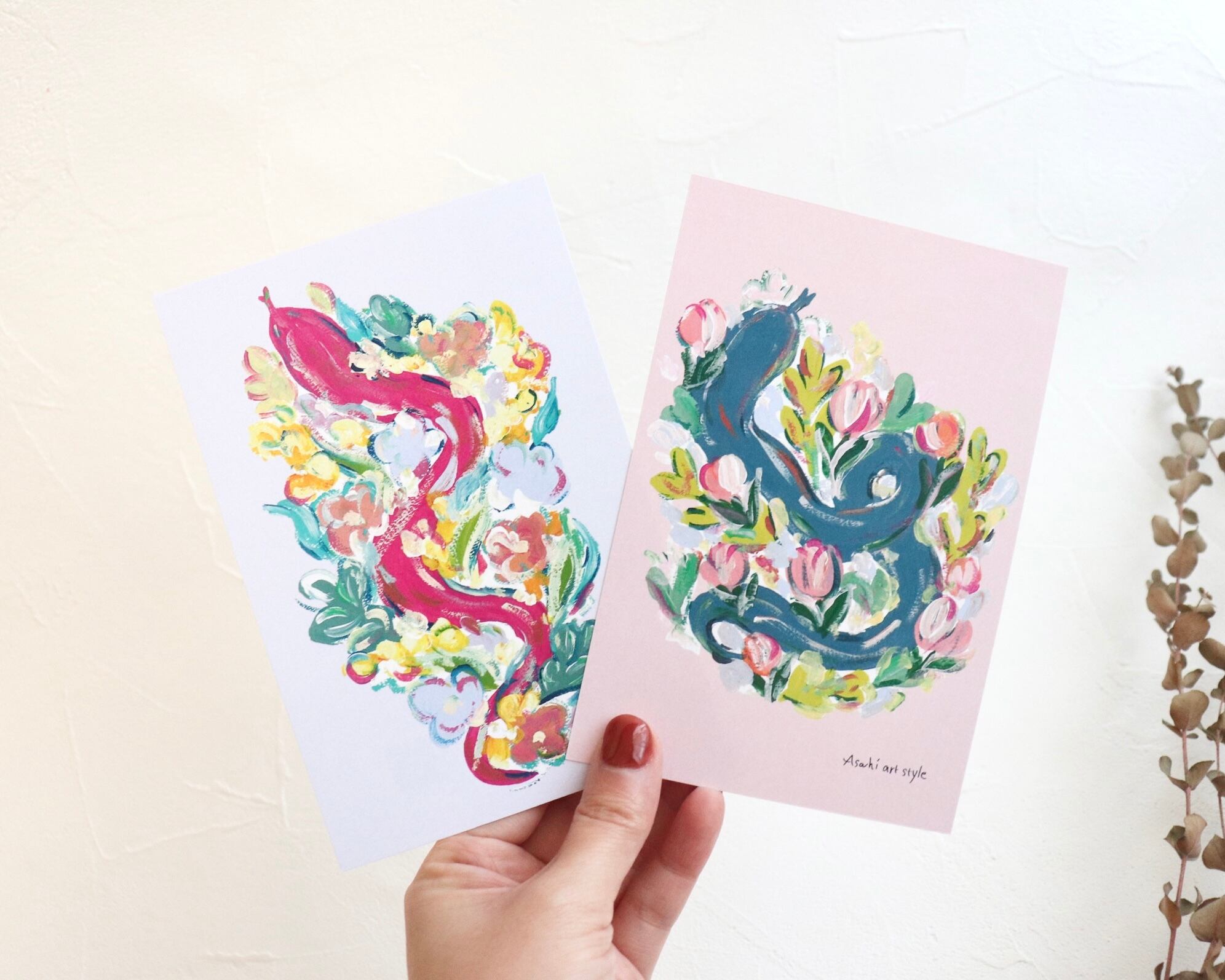 筆跡の残る、優しい色とタッチで描かれた蛇と花柄